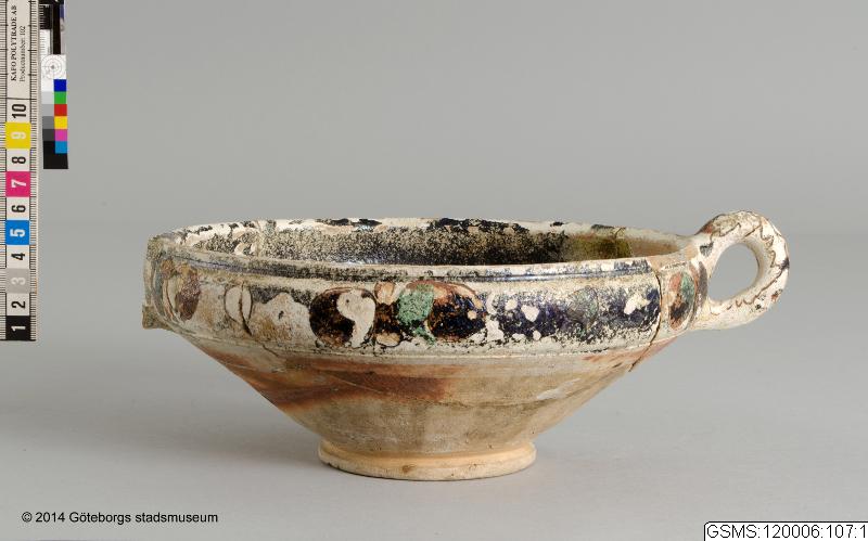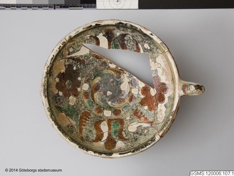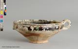 Skål hoplimmad av skärvor från fynd nr 107. Ej komplett, en stor skärva på buken samt en hänkel saknas. Två hänklar (varav en saknas). Glaserad och dekorerad insida samt mynningskant, oglaserad buk.