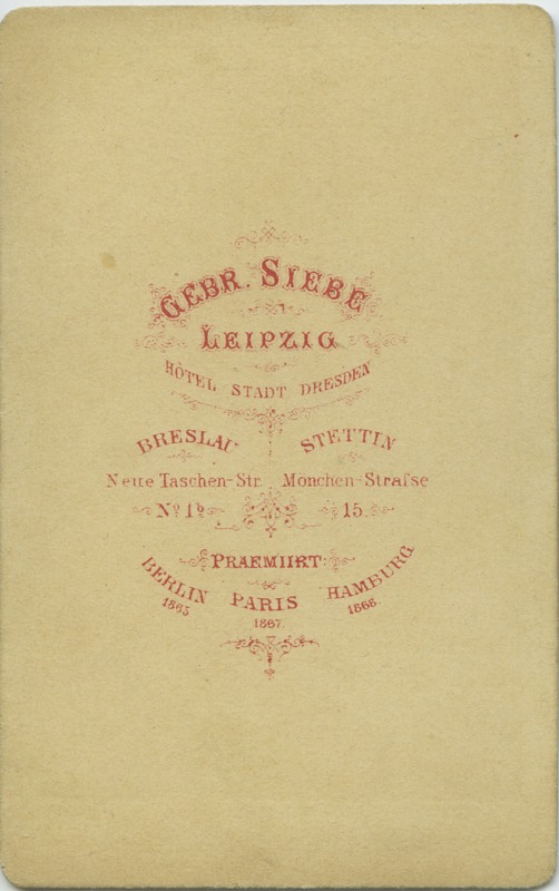 Gebr. Siebe, Leipzig, Hòtel stadt Dresden. Breslau, Neue Taschen-Str No 1b. Stettin, Mönchen-Strasse, 15. Praemiirt, Berlin 1863, Paris 1867, Hamburg 1868.