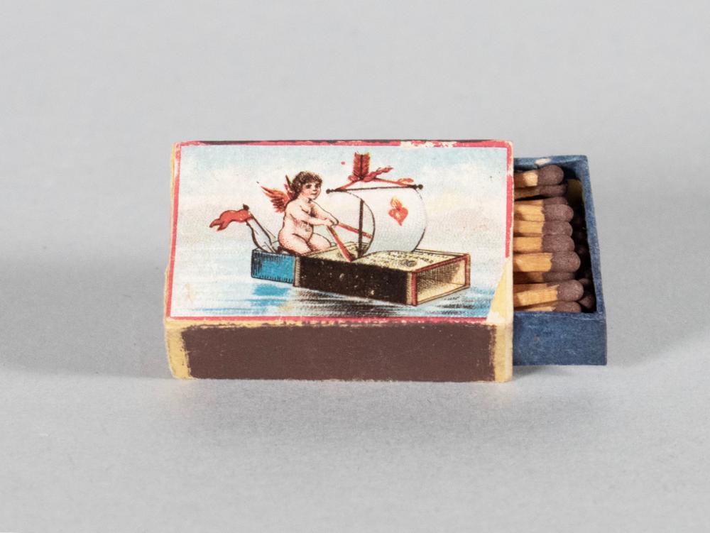 • Tändsticksask med bild av kerub sittande i segelbåt gjord av en tändsticksask. Bruna tändstickor med brun tändsats.