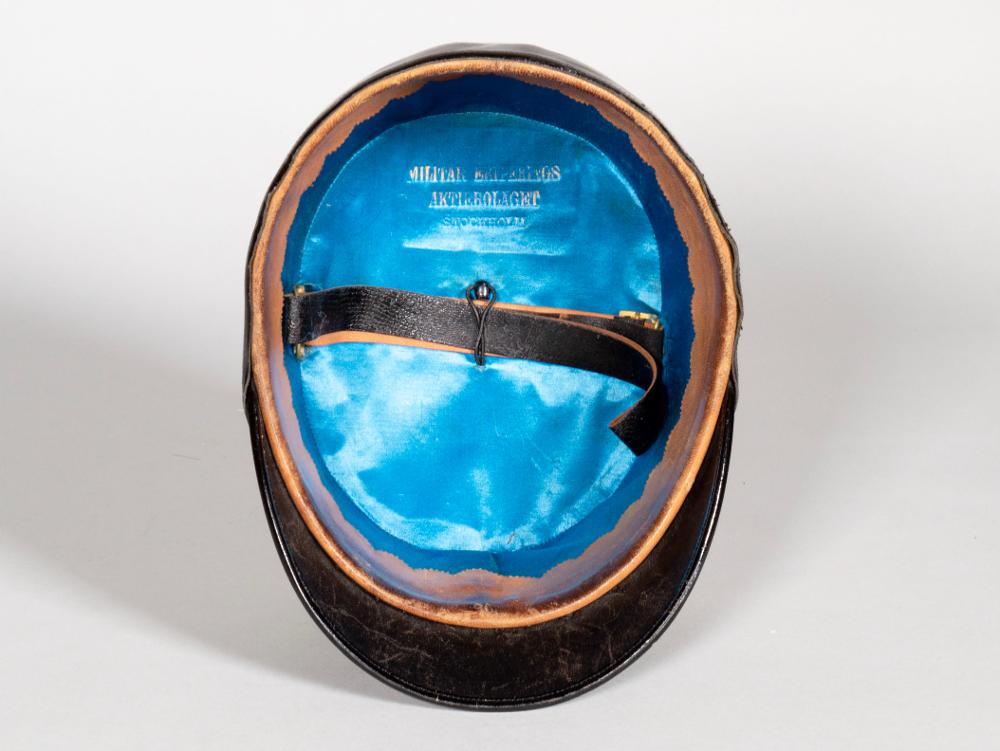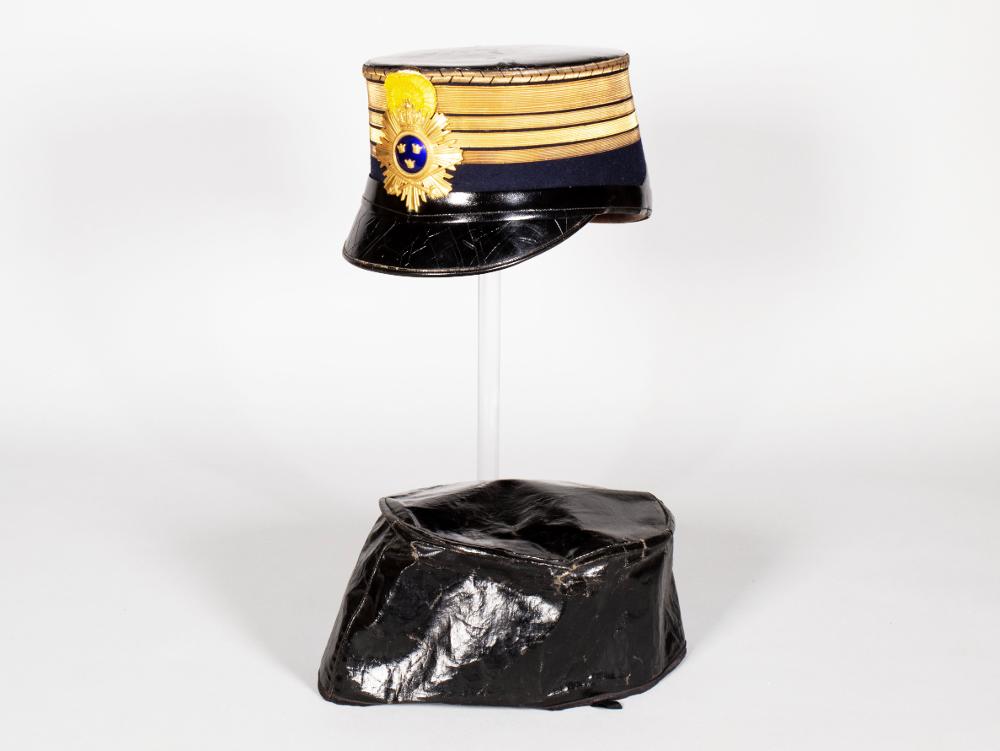• Paradmössa med skärm, med guldband runtom samt emblem med tre kronor framtill. Skärmen av lack. Tillhörande mössskydd av svart lack.