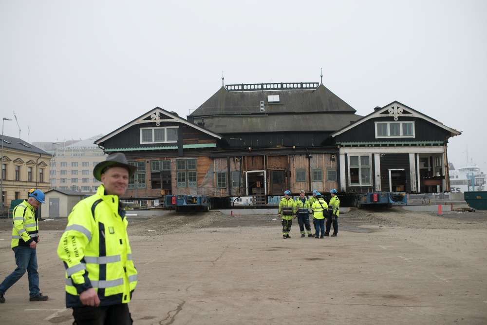 "Så är klockan 15.30, tid för utlovad flytt. Det dröjer lite, ansvariga sitter på huk framför byggnaden, går runt tittar. Jag väntar på klartecken, säger Nic i högtalaren. Och så äntligen är det dags för nedräkning, tio, nio, åtta, sju… och plötsligt rullar Ångfärjestationen över torget. Det går långsamt och vid ett tillfälle avstannar flytten. I bakgrunden syns alla gulklädda män vid byggbodarna och på andra sidan har ungefär 2000 människor samlats för att vara med om den historiska flytten. Det står också människor på parkeringen Ångfärjan och ute på piren, vid Parapeten. En drönare svävar över flytten. Nic underhåller med berättelser om byggnadens historia och han ber också personer ur publiken att berätta minnen. Någon tog sin första tura med Sundsbussen Pernille på 1950-talet. En annan har åkt över och köpt kassar fulla med ost. Vilken sort? Undrar Nic. Ole, gamle Ole. En Sundsbuss seglar förbi och tutar några hälsningar. En man uttrycker sin vrede över händelsen i Nics mikrofon. Nic ber fler människor att berätta om minnen. Vi har en terapigrupp här, säger han.