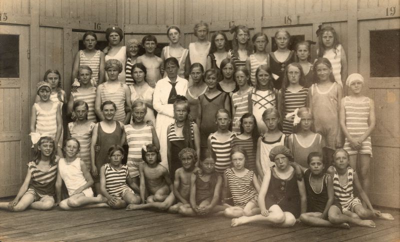 • Fotografi av en ledare och flickor där nästan alla har baddräkter.