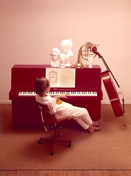 Fotografi av en interiör med piano målad i rött. Ovanpå pianot står 4 byster av bl a Beethoven samt ett valthorn. En cello står lutad vid pianot. På en pianostol sitter en modell klädd i vita byxor och vit t-shirt. Han är barfota.