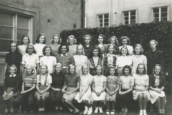 Fotografiet är taget under Eva Ljungqvists första år på Flickläroverket (nuvarande Olympiaskolan). Klass 1:4 a . Bakersta raden, från vänster: 1:a Gunilla Olsson, gift med Hasse Alfredsson (entertaine...
