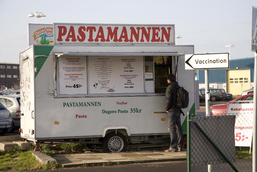 Det är den 17 november och för ovanlighetens skull denna månad, skiner solen. Lena Wilhelmsson och jag (Birgitta Witting) promenerar mot Magasin 405 där man vaccinerar de flesta vuxna i Helsingborg mot den så kallade svininfluensan. På vägen tar Lena bilder på en handtextad skylt vid ingången till hälsokostaffären ¿Life¿ på Hästmöllegränd. Det står ¿Vi har handsprit¿. En vanlig syn denna höst. Söder om Knutpunkten, på väg mot Campus, ser vi den första skylten utformad som en pil med texten ¿Vaccinering¿. Vi följer skyltarna och sneddar över en parkering. Här ser vi flera personer med sina kallelsebrev i handen. En stor skylt med texten ¿VACCINERING¿ på Magasin 405 visar vägen. Framför magasinet står en barack och det är här som den första registreringen sker. Den här veckan vaccineras alla som är mellan 30-39 år. Lena tar lite bilder och sen ber vi om ursäkt, tränger oss före i kön och går in i baracken. Här sitter sjukvårdspersonal och tar emot besökarna. Det känns ofräscht i baracken och det luktar illa, lite som konserverade, gröna ärtor. Därefter går vi ut ur baracken och in i magasinet. Via en trappa leds vi upp till den stora lokal där vaccineringen sker. Även trappan känns ofräsch. Betong, grått, giftfälla för råttor och möss nedanför trappan. Så går vi uppför trappan och möts av sorl från vaccineringslokalen. När vi kommer in i vaccineringslokalen slår värmen emot oss. En kvinna som har till uppgift att lotsa besökarna rätt berättar att det förut varit ganska kallt så nu har man fått fler värmefläktar. Den här dagen lyser även novembersolen in. Även här luktar det som av konserverade ärtor. En ganska oangenäm lukt. En sjuksköterska ler och säger att det ändå luktar mycket bättre nu än i början. Jag frågar kvinnan som har till uppgift att informera hur det är att ha Magasin 405 till arbetsplats och hon säger att man vänjer sig. Men, säger hon, det inte är en bra plats för barn att vaccinera sig på. De blir rädda i den här miljön. Dessutom ekar deras skrik i hela lokalen. Alla barn skall ju ha vaccinerats på vårdcentraler och i skolor men en och annan som missat sin vaccineringstid, eller ångrat sig, får sin spruta här. Strax hör vi just ett sådant hysteriskt gråtande barn. I lokalen har varje vårdcentral sin ¿ö¿ och alla som skall vaccineras går till den enhet de tillhör. Det hela känns väldigt enkelt och provisoriskt. Lappar med vårdcentralens namn är uppklistrade på pelare och där har vårdcentralerna satt upp några stolar och bord. Trafikkoner delar av enheterna och bildar på så sätt små ¿rum¿. Längst ner i lokalen står det ¿WARAN¿. Här skall alla som tar det blodförtunnande medlet waran vaccinera sig. Här finns även läkarpersonal. Bakom en skärm står en vilosäng. Ingen annanstans finns sängar så sjuksköterskan Gun-Marianne Boson har gjort en provisorisk bädd vid väggen i närheten av den enhet hon arbetar på, Stattena vårdcentral. ¿Om någon skulle svimma kan jag inte släpa dom ända bort till den andra sängen¿, säger hon. Hon ser snäll ut och säger att de enda som svimmat är de som är väldigt rädda. Det är lugnt i lokalen. Folk kommer, hittar sin enhet, får sin spruta och information, inga köer, allt flyter på. Jag frågar sjuksköterska Christina Behrens hur många sprutor hon ger på en dag och hon berättar att det kan vara upp till 150-200 stycken om dagen men minst 120 stycken. Hon säger också att hon i snitt ger en spruta var 90 sekund. Lena Wilhelmsson tar bilder och de flesta är positiva till att medverka.