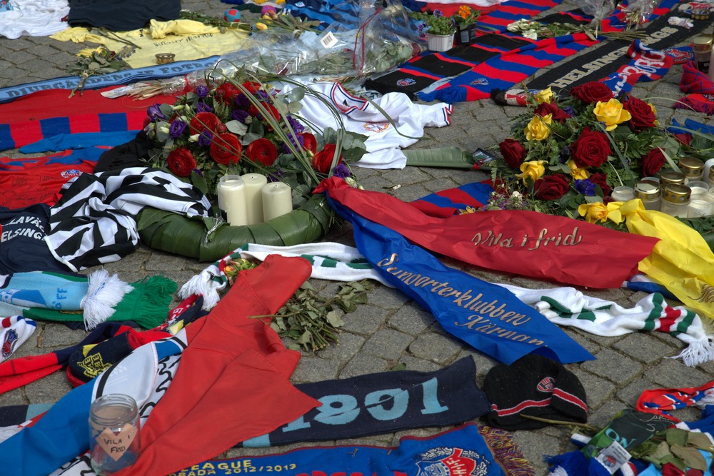 I samband med att Djurgården mötte HIF i årets första allsvenska match på Olympia (30/3-14) blev en 43-årig djurgårdssupporter nerslagen och dog av skadorna. Både under matchdagen och kvällen före var det mycket stökigt i Helsingborg med flera fall misshandel och vandalisering. På måndagskvällen arrangerade HIF:s supporterklubb Kärnan en manifestation mot våldet där flera tusen människor deltog. En minnesplats växer sig allt större av utlagda halsdukar, klubbtröjor och ljus. Den 10 april plockades minnesplatsen ner av PEAB och museets personal var med och tog hand om materialet. Museets fotograf dokumenterade på manifestation och nedplockningen. Någon dag senare gjordes ett urval. Se även: Dokumentationer: ”Det räcker nu”.