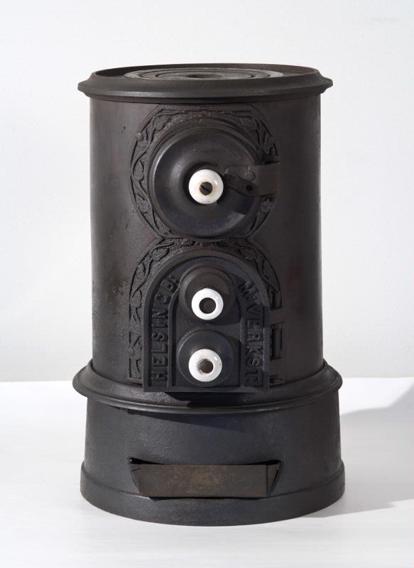 Kamin av gjutjärn, med två luckor framtill samt sotlucka. Luckorna, den översta rund den understa portalformad, har slingrande växtmotiv runtom och en resp. två runda handtag i porslin. Den nedre luckan har texten: "HELSINGB: M: VERKST:".Upptill på kaminen finns en värmeplatta med spisringar.