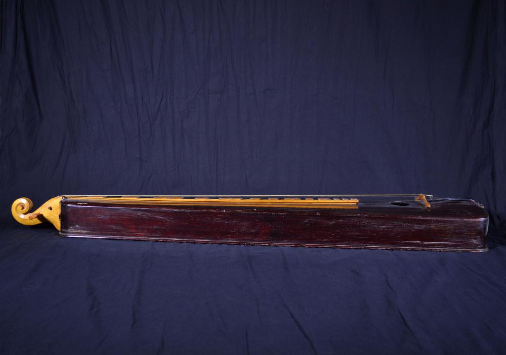 • Psalmodikon, målad i mahognyfärtg, fiolsnäcka för strängskruvar