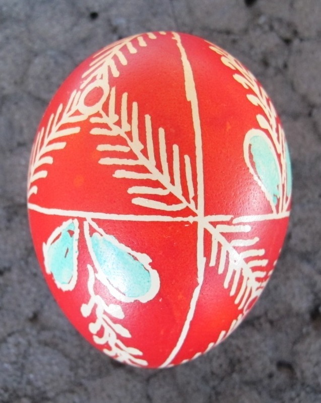 • Målat hönsägg i rött med mönster i vitt och grönt.