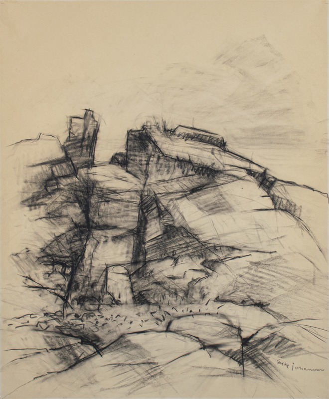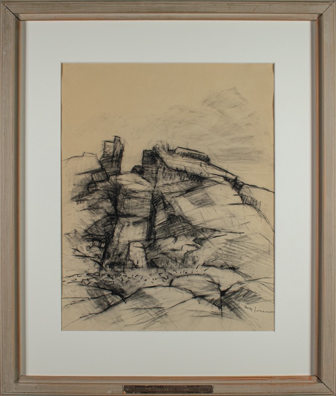 • Hallar, klippbranter och bergsformationer. Svartkrita inom passepartout och grå ram.