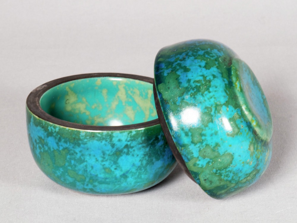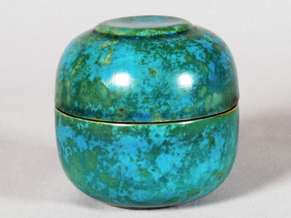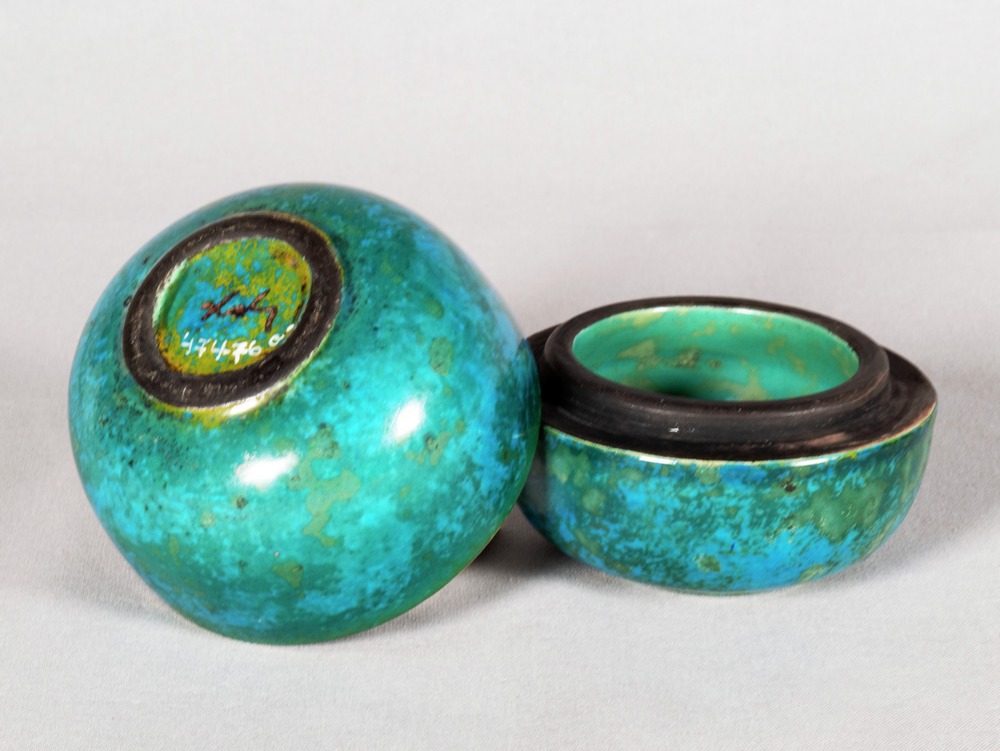 • Bonbonnière av stengods med blågrön glasyr. Två delar