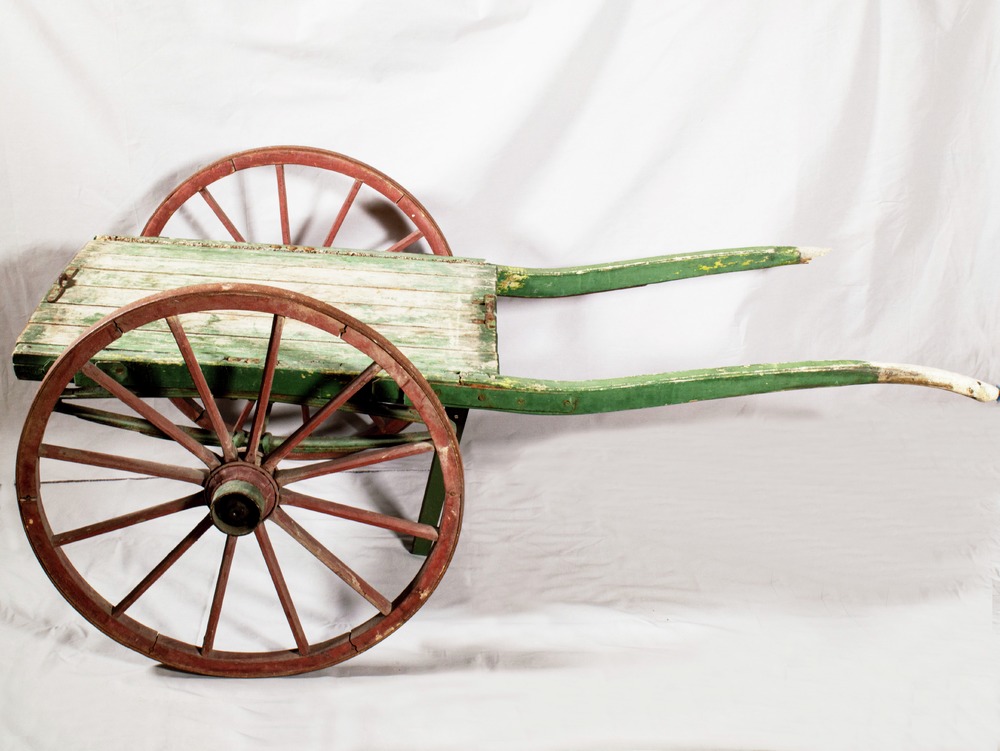 • Grönmålad trädgårdskärra i trä, med två rödmålade, fjädrade och järnskodda hjul samt handtag och stödben.