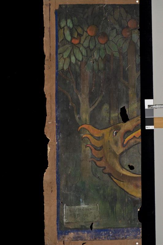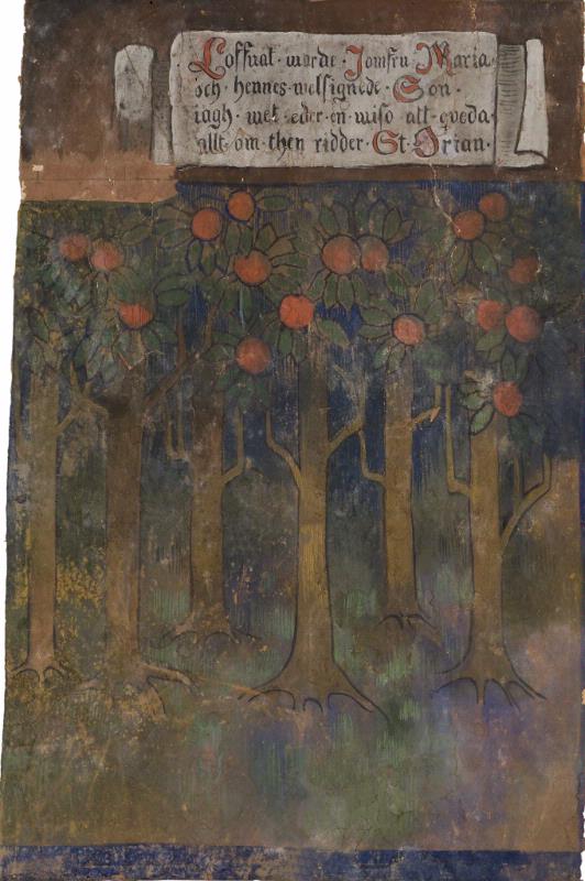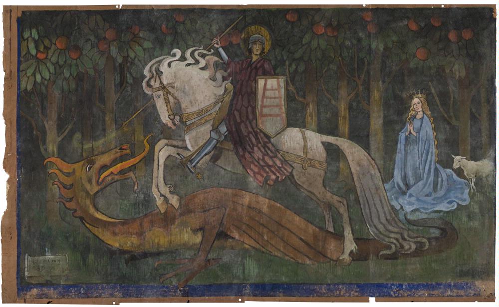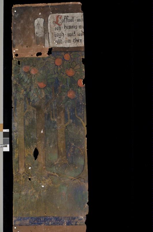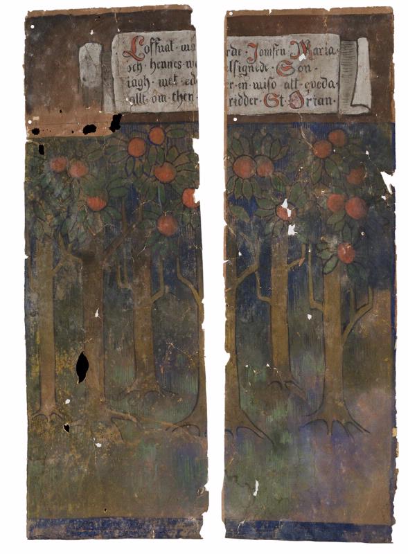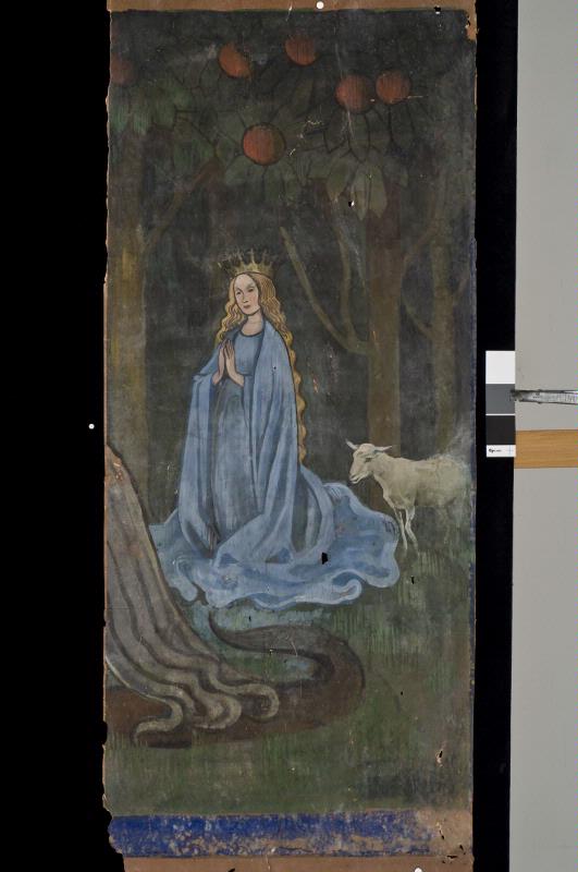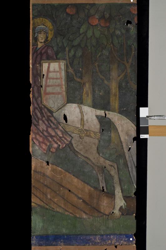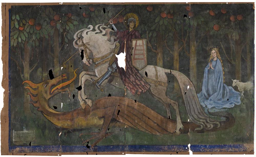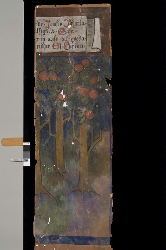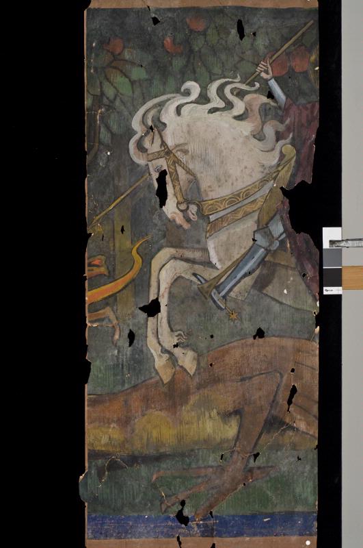 Tapet med målning av Gisela Trapp. Motivet har varit monterad i ett hörn och sektionerna a-d har suttit till vänster på långsidan och motivet föreställer S:t Göran och draken. S:t Göran sitter i rustning på en vit häst och i handen har han en sköld med konsul Trapps vapen (en trapp) och i andra handen ett spjut som han riktar mot draken. Bakom hästen står prinsessan med ett får och i bakgrunden äppelträd. Sektionerna e-f är högre och har suttit till höger om hörnet och de har samma bakgrundsmotiv med äppelträd och överst texten: Loffvat warde Jomfru Maria och hennes welsignede Son iagh wet eder en wisa att queda allt om then ridder St Jrian