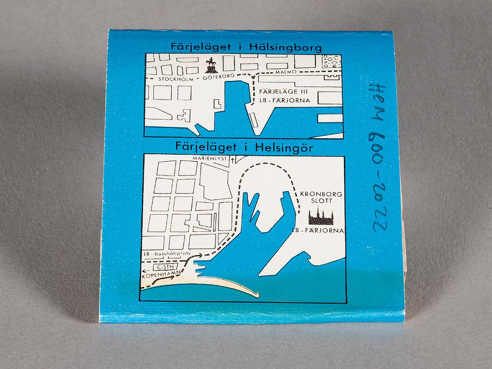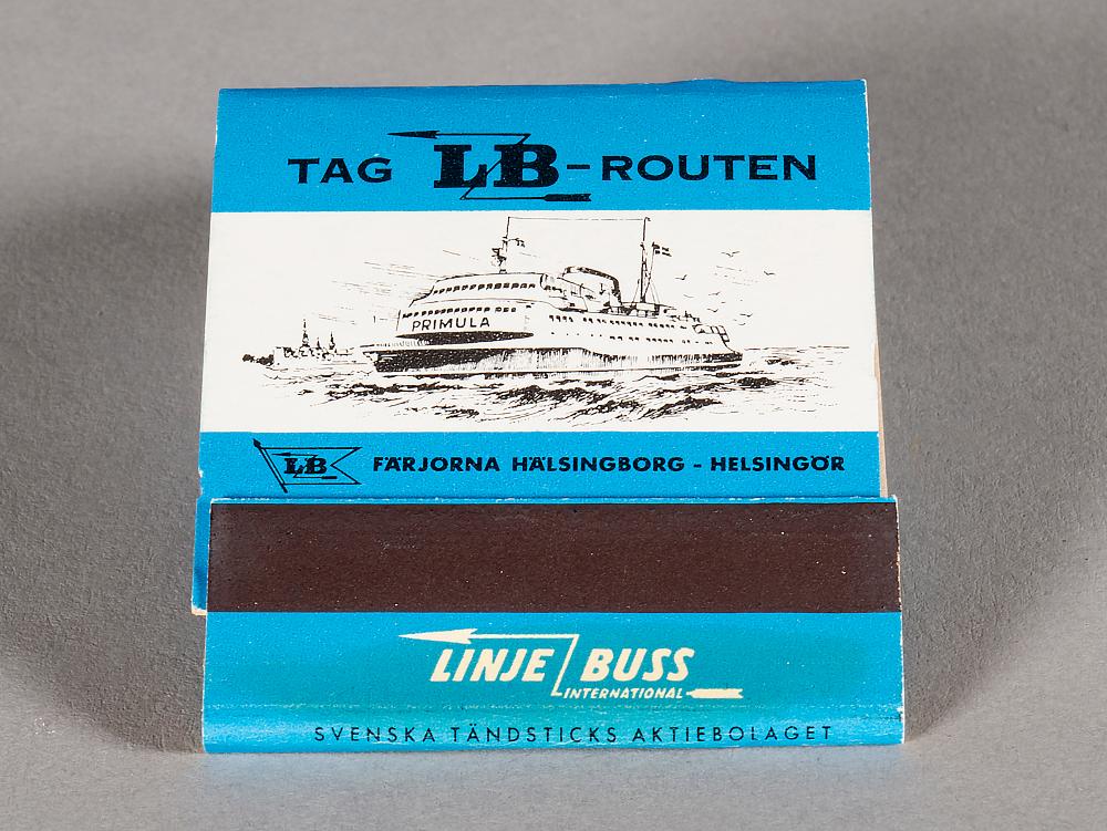 Reklamtändstickor från LB-färjorna. Etui med platta tändstickor som är fästade i varandra i två lager, vilka i sin tur är fästade i ett tunt pappetui med ett plån. På etuiets framsida, som går i vitt och blått, finns fartyget "Primula" avbildat. Bakom fartyget skymtar vad som troligen är Helsingörs stadssiluett. Ovan fartyget syns texten "TAG LB-ROUTEN" i svart. Under fartyget syns texten "LB" inskrivet i en vimpel, samt "FÄRJORNA HÄLSINGBORG - HELSINGÖR". Under texten finns en flik med plån samt "LINJEBUSS / INTERNATIONAL" och en zigzag-formad pil i vitt. Nederst står företagsnamnet "SVENSKA TÄNDSTICKS AKTIEBOLAGET" i svart text. På etuiets baksida finns en skiss över färjeläget i Helsingborg samt färjeläget i Helsingör. Inuti etuiet finns tändstickor med rosafärgat tändämne.