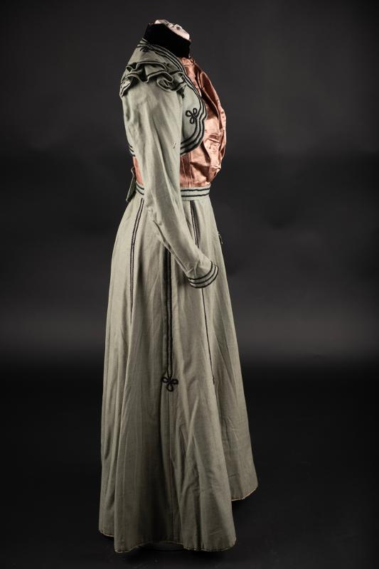 Lång kjol i grågrönt ylletyg helfodrad med grått ylle. Kjolen har 7 våder och stängs mitt bak med 3 hyskor och hakar. Alla sömmar utom mitt bak är dekorerade med svarta sidenband som går ner på vardera sida av sömmen halvvägs längst kjolens längd och formar 3 öglade knoppar. Kjolen har en fick mitt bak som är gömd i ett av vecken. Fickan består av två fickskyltar i samma grågröna ylle som klänningen och en fickpåse av grå lakansväv. Kjolen är fållad med en bred fåll av ett tyg som är vävt i blått som går över i en väv i brunt. I nederkanten har kjolen en fransbård, en så kallad ”brushed braid hem”.