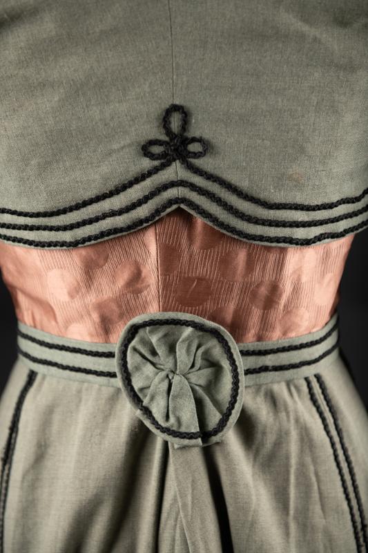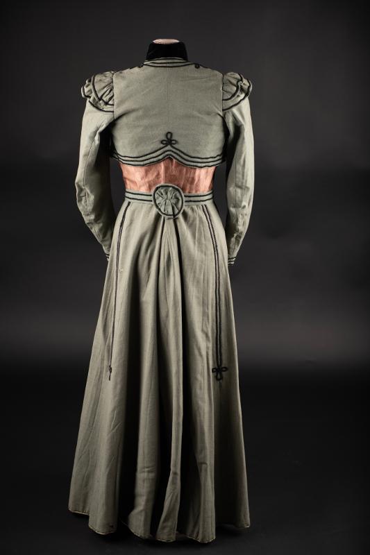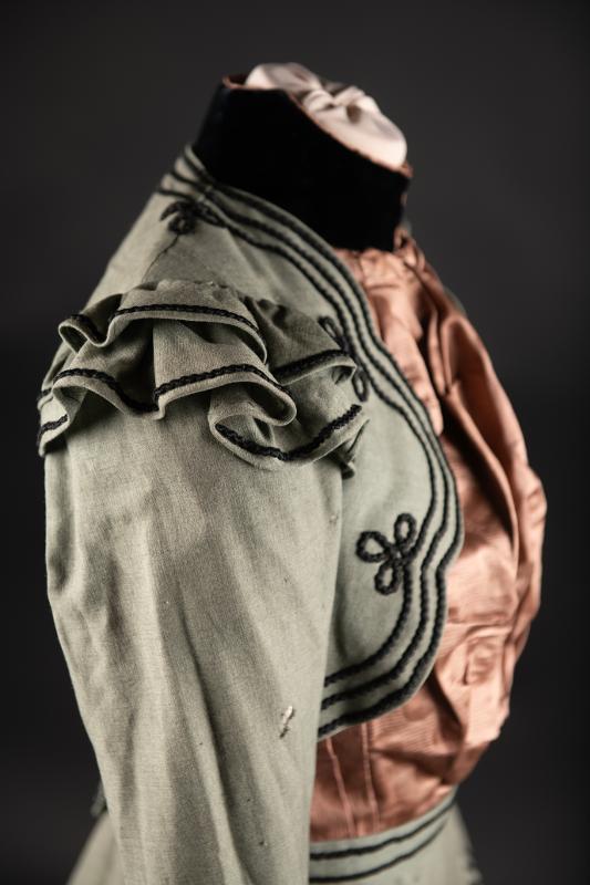 Kort bolerojacka med långa ärmar i grågrönt ylletyg. Bolerons liv består av 4 stycken, 2 fram och 2 bak. Vid axlelsömmarna fram har livet skarvats med varsin kil på båda sidorna. Boleron lämnas öppen fram och har udd-formade kanter fram kantade med 3 bårder av svarta sidenband. Bårderna av svarta band går runtom bolerons nederkant bak och runt halsringningen. Längst med den yttersta bården går flera 3 öglade knoppar. Boleron är fodrad med ett tyg i skiftande grönt-brunt siden. Under vänster framstycke sitter en liten ficka på insida av fodret.
