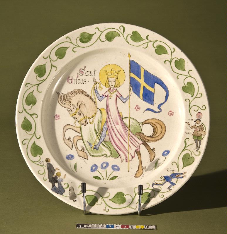 Tallrikens motiv är den helige Erik avbildad som ryttare på en häst med den svenska flaggan i sin hand. Längs kanten är Oscar Trapp och invid honom Gisela Trapp samt deras hund avbildade. Vidare amiral Jakob Hägg samt den holländske 1600-talsmålaren van der Velde. Denne var upphovsperson till de målningar av slaget i Öresund 1658 där den svenska fanan avbildades. Van der Veldes återgivning av sve...Visa hela
