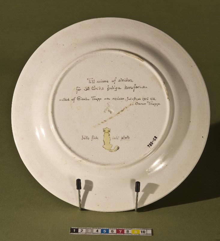 På tallrikens baksida står "Tll minne af striden för St: Eriks heliga korsfana målad af Gisela Trapp och skänkt Julafton 1906 till Oscar Trapp" Här är också en bild av en hund och vid denna står "Fällo fick inte plats"