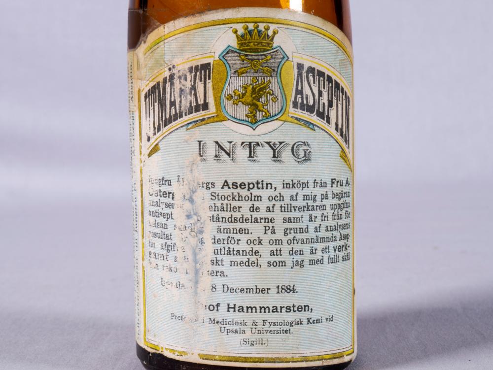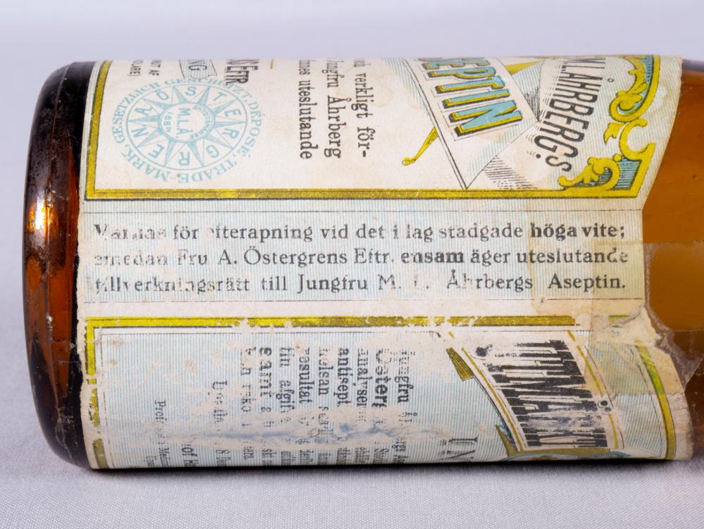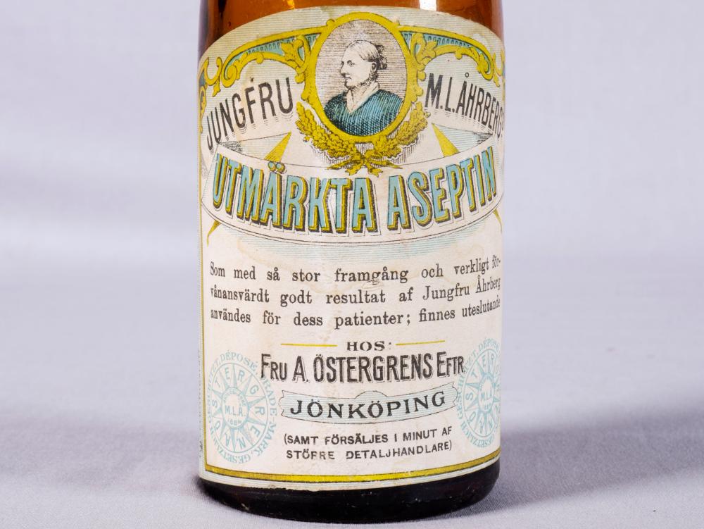 • Flaska i brunfärgat glas med etikett på fram- och baksida. På framsidesetiketten står det bland annat: Jungfru M.L. Åhrbergs Utmärkta Aseptin. Som med så stor framgång och verkligt förvånansvärdt godt resultat af Jungfru Åhrberg användes för dess patienter; finnes uteslutande hos Fru Östergrens eftr. Jönköping (samt försäljes i minut af större detaljhandlare)