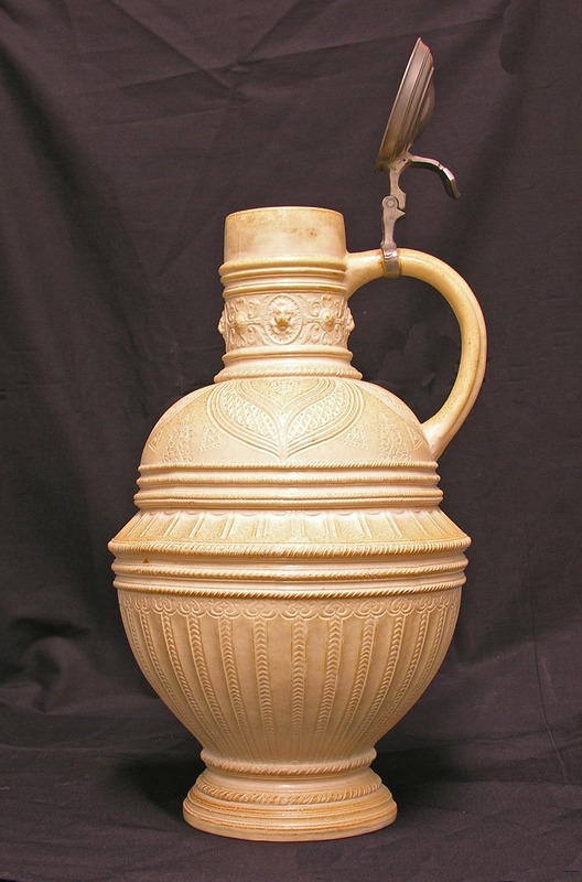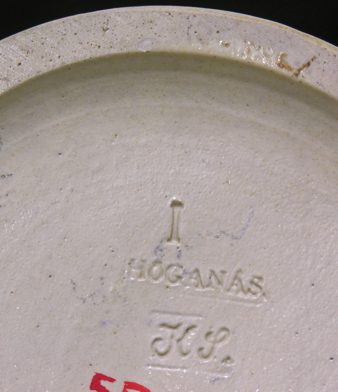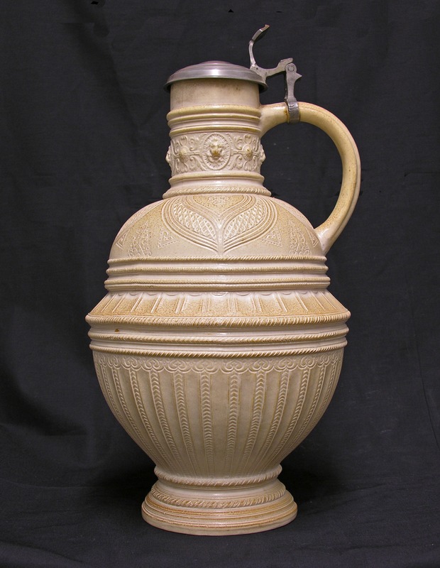 Prydnadskärl av stengods med formpressad dekor och lock av tenn. Rund bukig form, smal hals med maskaroner, runt handtag. Stämplat I, HÖGANÄS, KS.