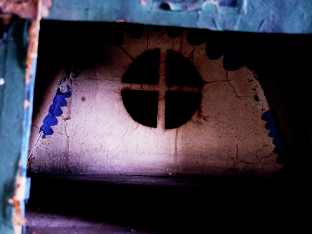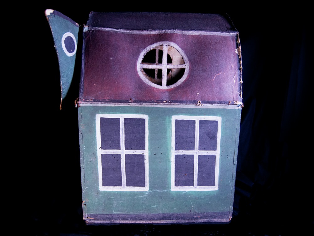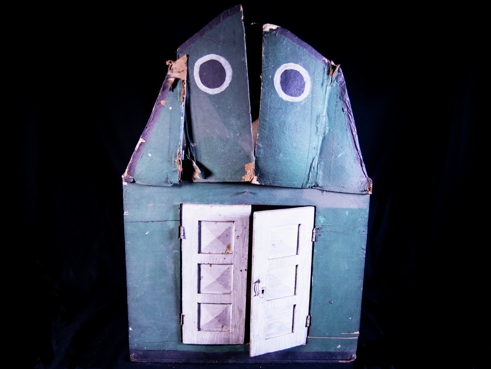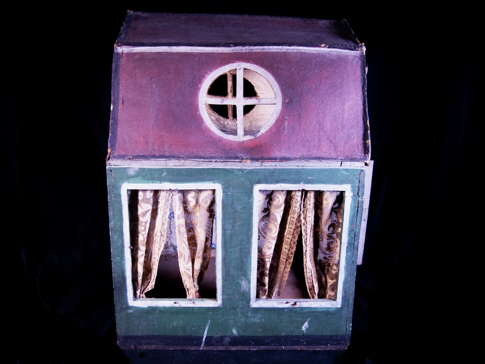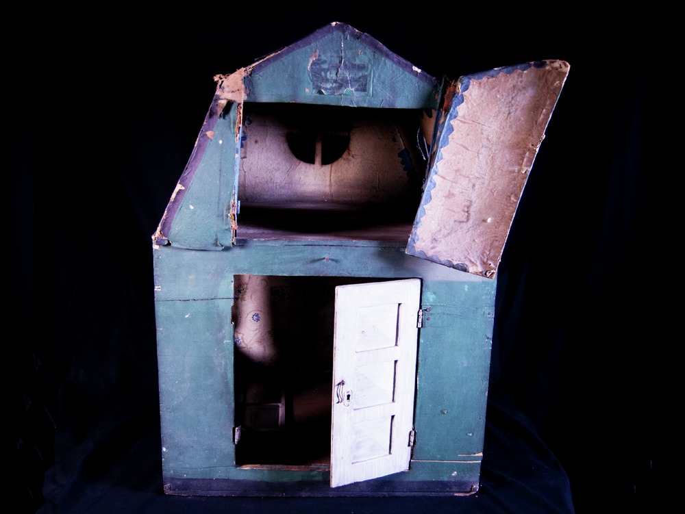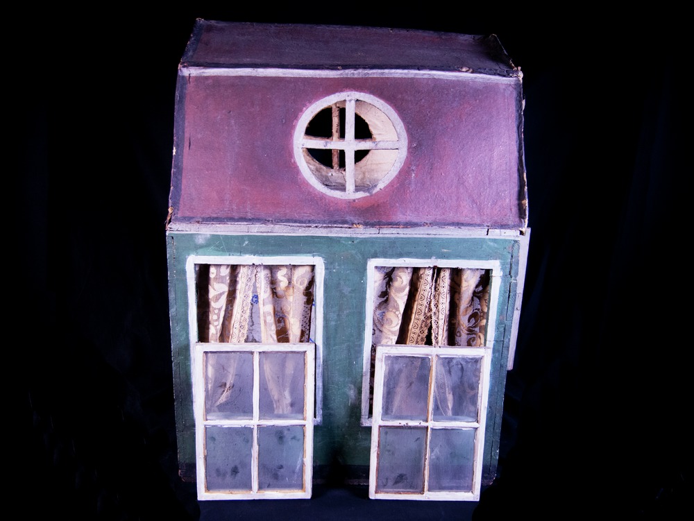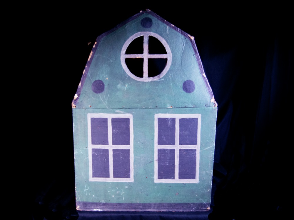 74 cm högt dockskåp i två våningar om vardera ett rum av trä och papp. Utsida: Rödaktigt mansardtak med 3 rosettfönster utan glas, vita ramar; grönmålade fasader, på nedervåningen 2 påmålade svarta fönster med vita ramar på ena sidan, och 2 motsvarande på kortsidan samt 2 glasfönster med vita ramar på andra långsidan (vilka ligger inne i huset). På andra gaveln, ovanvåningen, pappdörrar som vikes,...