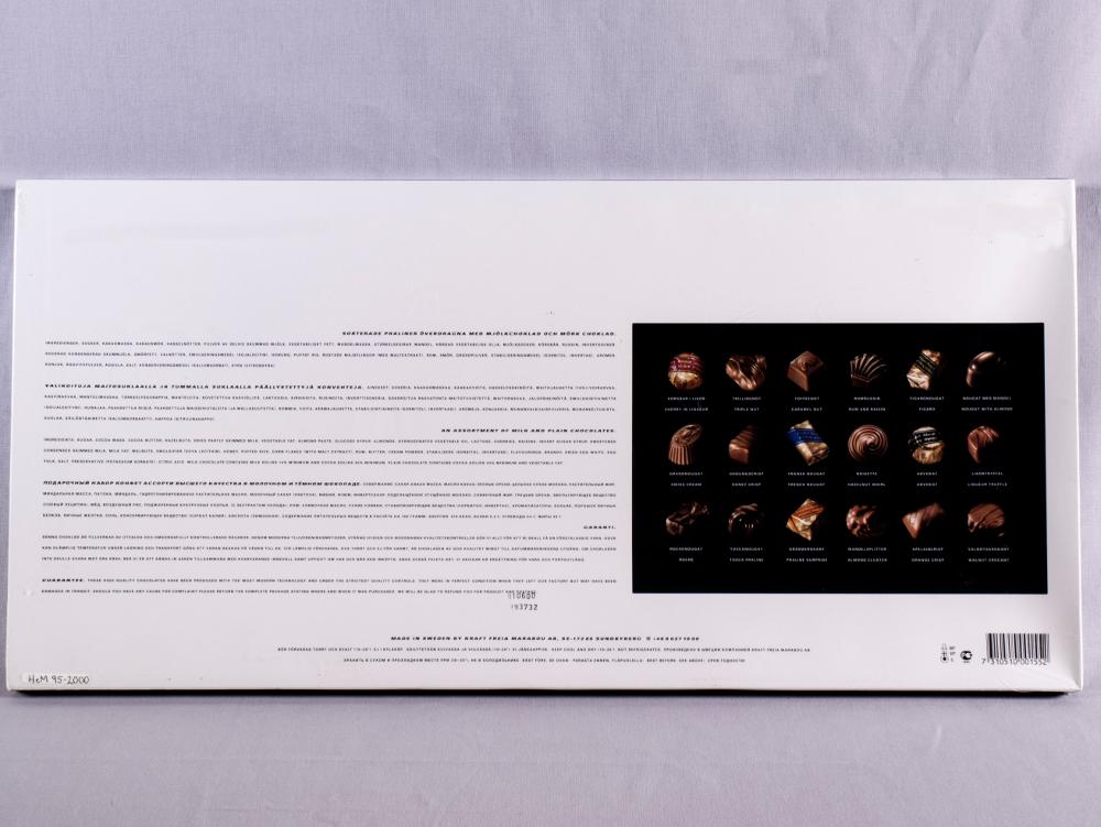 Temat för julmarknaden på Fredriksdals friluftsmuseum var julgodis. Ansvariga för julgodisutställningen i södra flygeln var Annika Mamgren och Maria Nyman-Nilsson. de ringde till Kraft Freja Marabou och fick denna provask som gjorts i 100 exemplar i marknadsföringssyfte.