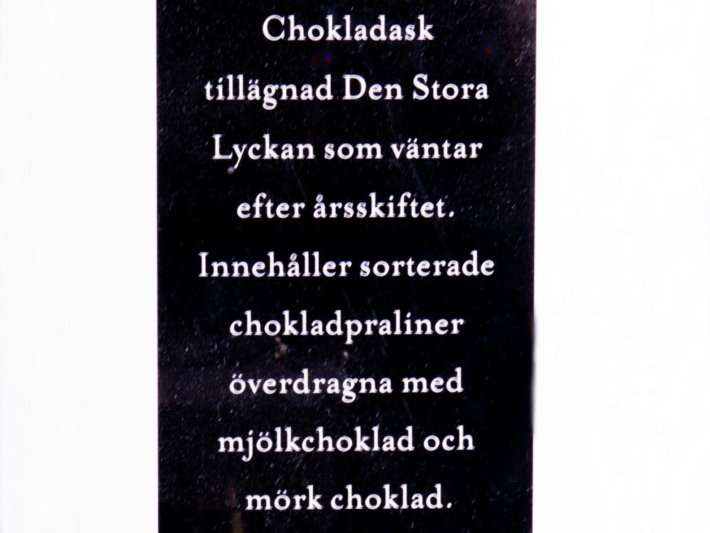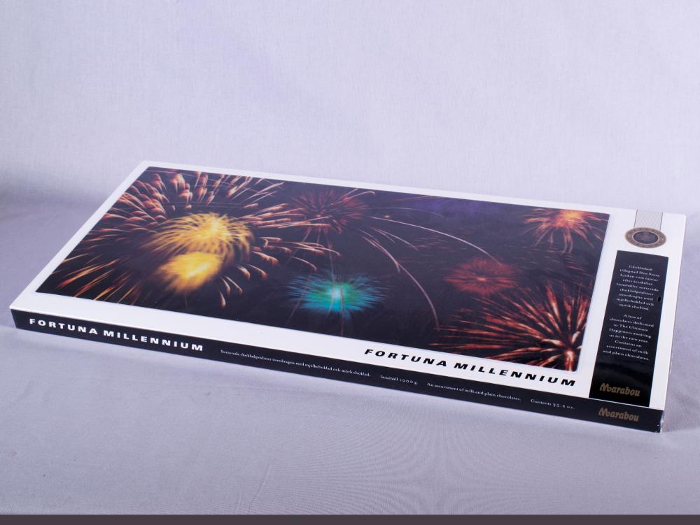 Provchokladask med hollogrambild av fyrverkerier på ovansidan. Text ovansidan: "FORTUNA MILLENNIUM, MARABOU, Chokladask tillägnad Den Stora Lyckan som väntar efter årskiftet. Innehåller sorterade chokladpraliner överdragna med mjölkchoklad och mörk choklad."