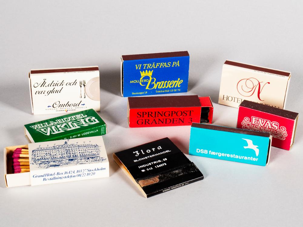 • Liten tändsticksasksamling med olika reklamtryck på från uteställen främst i Helsingborg.