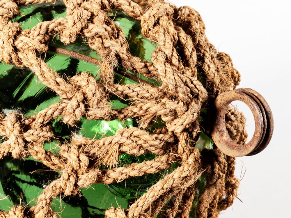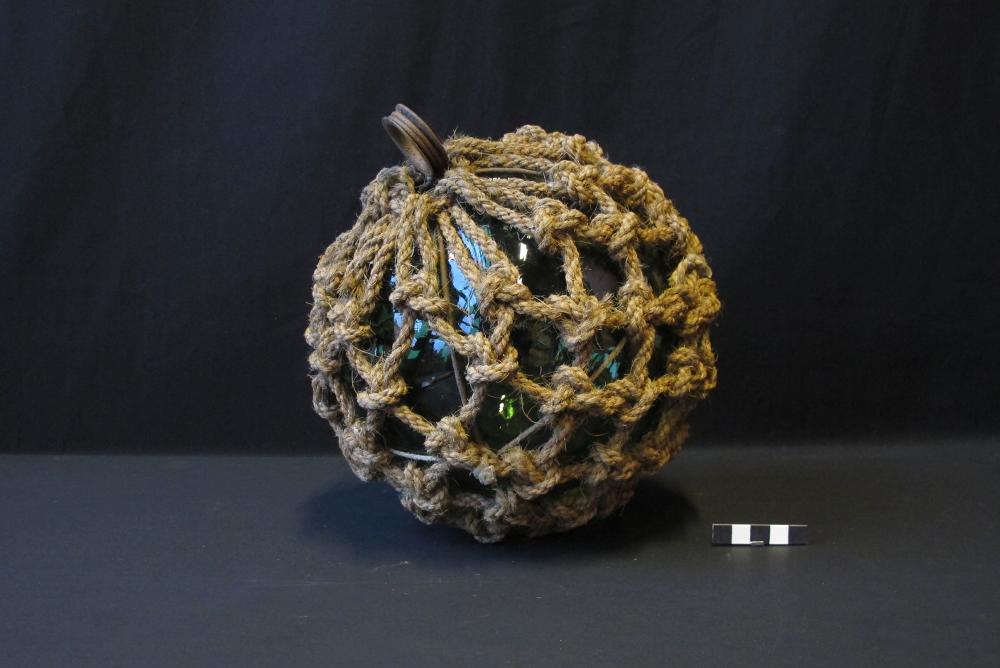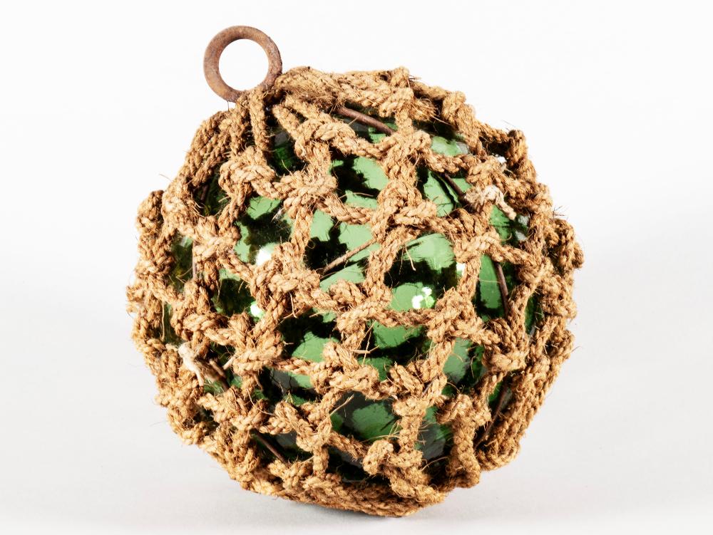 • Flöte av grönt glas, med grovt nät omkring. Grov ståltråd i två varv kring kulan med en järnring vidfästad.