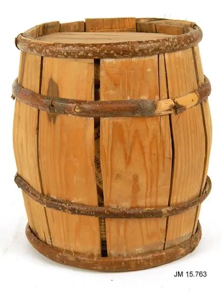 Tunna av trä, laggad. Etikett på ena sidan med texten: "Snus Nr 2, Robert Carlssons fabrik, Jönköping".