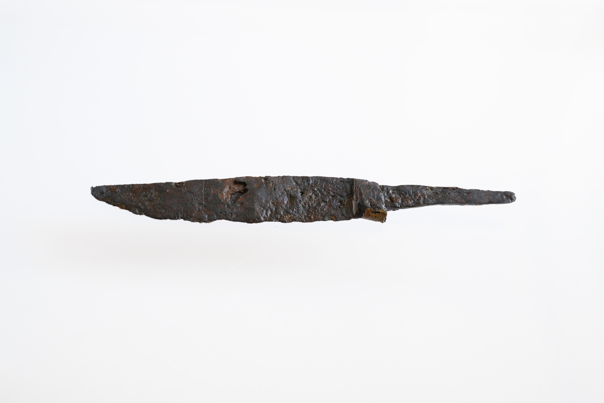 Kniv, från Getaryggen, Angerdshestra socken, Jönköpings län. Under 2012 utfördes metalldetektering vid Hovmejan/Bergsliderna som ett fortsatt led i projektet Getaryggen 1567 (Projektägare Stiftelsen ...