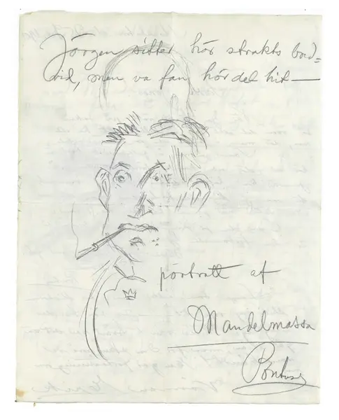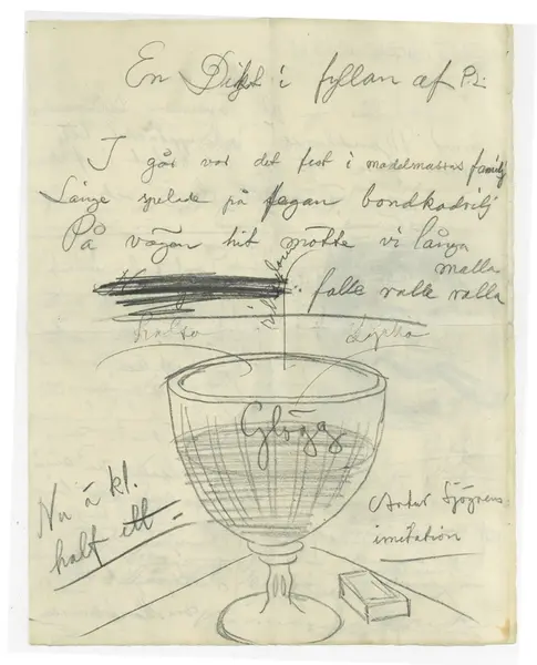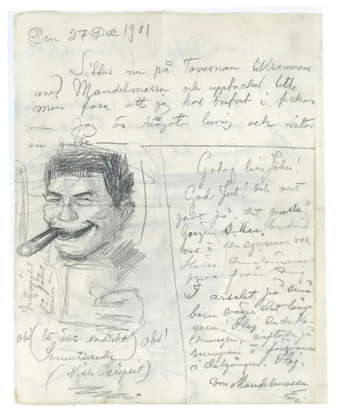 • Brev 1901-12-25 till 1901-12-27 från Pontus Lanner, Erik Lange till John Bauer, bestående av fyra sidor skrivna på fram- och baksidan av ett vikt pappersark. Huvudsaklig skrift handskriven med blyerts... Visa hela