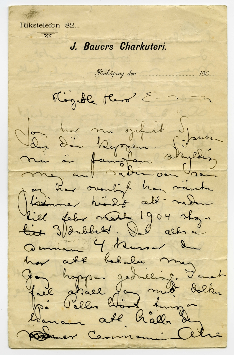 • Brev odaterat från John Bauer till Herr E-s-n, bestående av två sidor skrivna på fram- och baksidan av ett vikt pappersark. Huvudsaklig skrift handskriven med svart bläck. Brevet är oavslutat och sakn... Visa hela