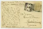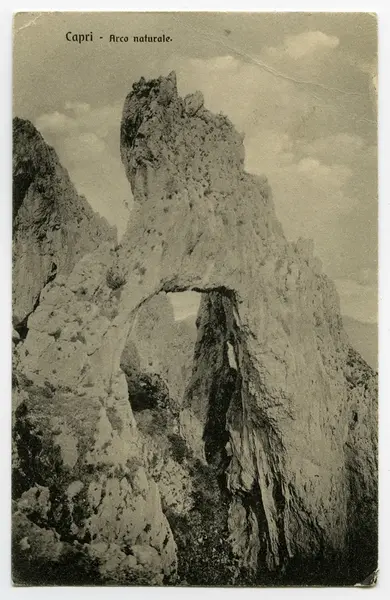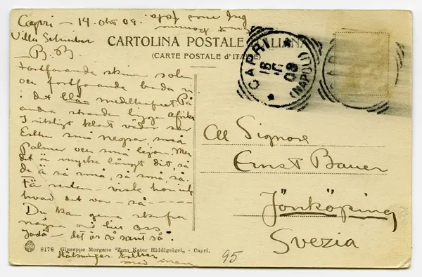 Brevkort 1908-10-14 från John Bauer till Ernst Bauer, skrivet på ena sidan av ett tjockt pappersark. Huvudsaklig skrift handskriven med svart bläck. Kortets motiv föreställer klippformationer på Capri. . [Sida 1] [Vykortsbaksida med tryckt text: CARTOLINA POSTALE ITALIANA (CARTE POSTALE dITALIE) längst ner: 8178 Giuseppe Morgano Zum Kater Hiddigeigei Capri, samt poststämpel CAPRI 16 10 08 (NAPOLI)...