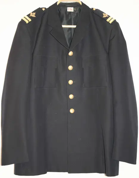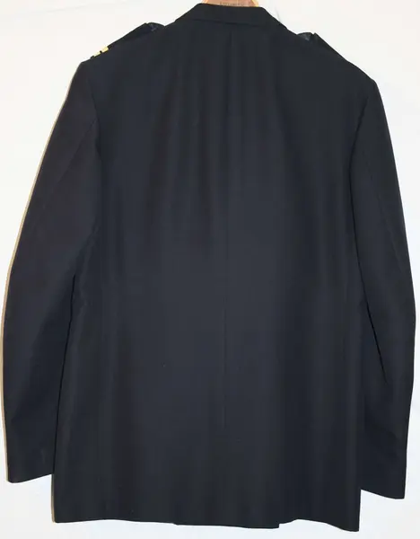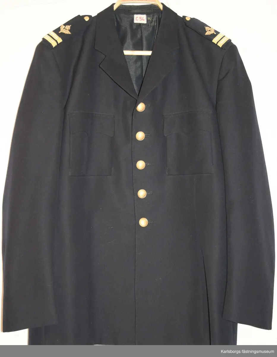 Storlek: C 108 Av mörkblått tyg, kavajskuren krage och slag av eradig typ. Knappar och bröstfickor i överensstämmelse med vapenrock m/1930. Utan sidfickor, nederkanten något lägre än grenen, fasta axelkalaffar som knäps med 14 mm uniformsknapp gradbeteckning på axelklafarna. Har använts av Rickard Lilja.