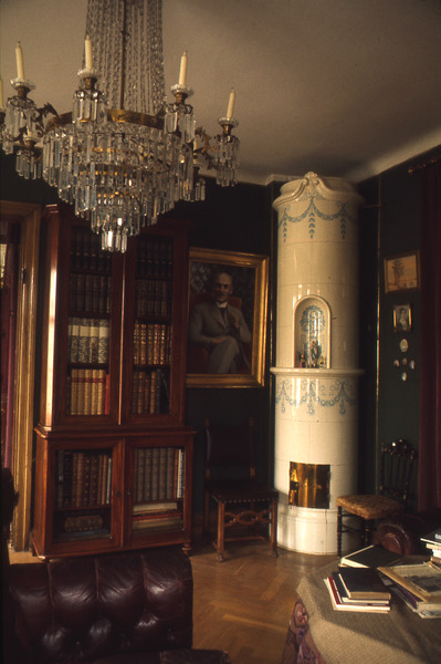 fotografi, bokskåp, kakelugn, ljuskrona, tavla, bok, bord, stol, duk, interiör, fåtölj, parkettgolv