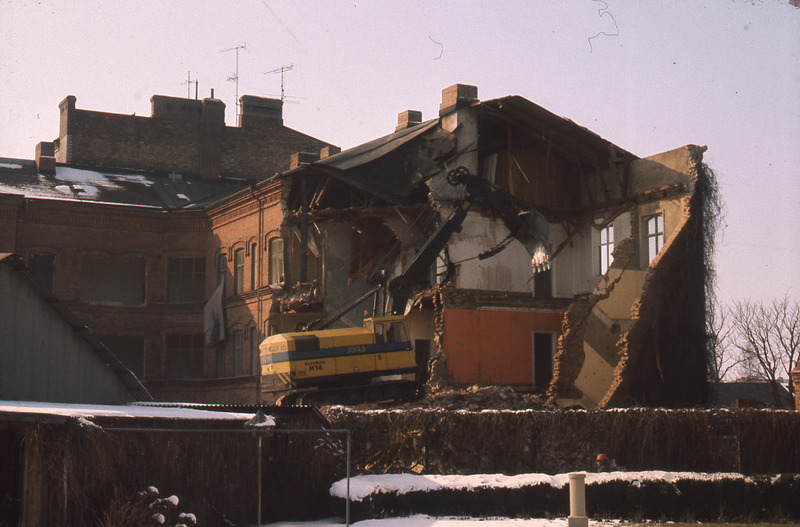 fotografi, hjälm, hus, bakgård, person, stadsbebyggelse, byggnad, grävmaskin, mattbom, träd, rivning