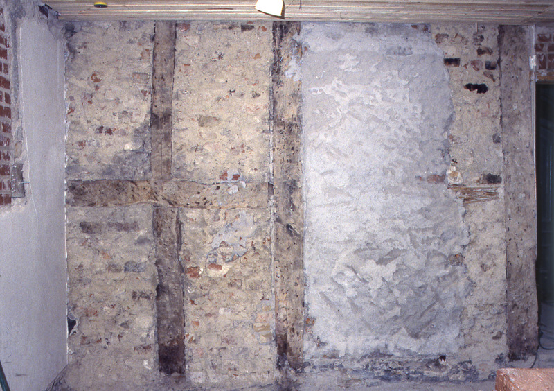 • Lund. Kulturen 24. Lindforska huset. Salens norra vägg. På 1970-talet igensatt dörrål i korsvirkesväggen. Från söder.