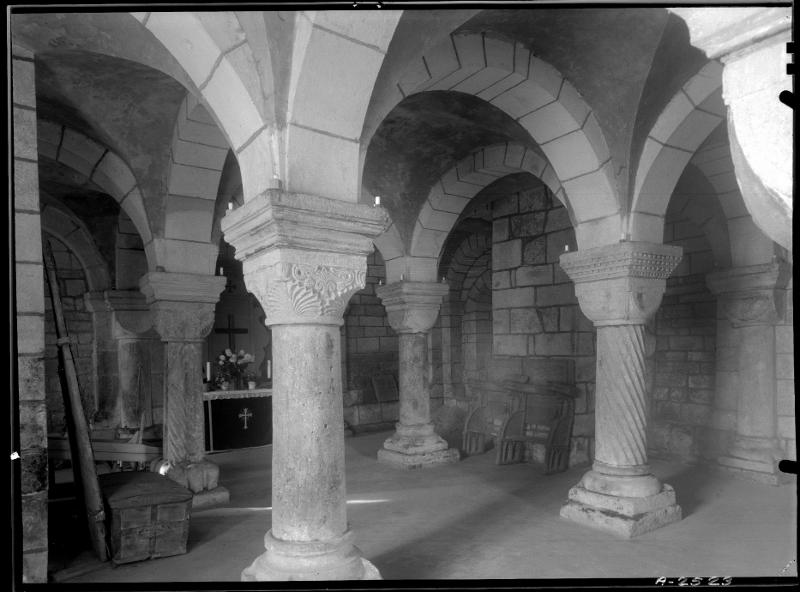 • Dalby. Dalby kyrka. Interiör. Krypta, kolonn.