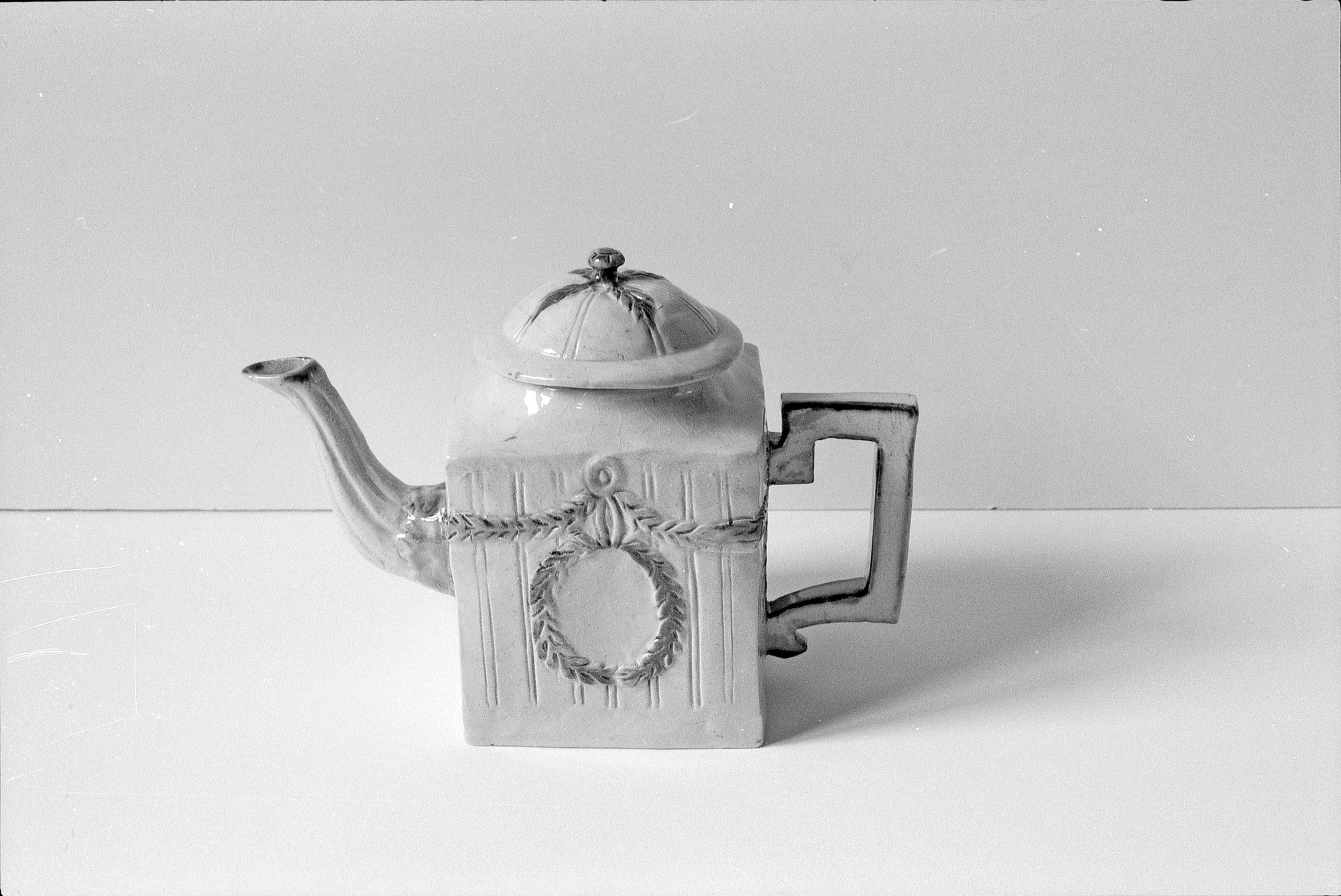• KM 76265. Tekanna, keramik med förvaringslåda i trä. Sölvesborg 1989 av Elisabeth Svensson.