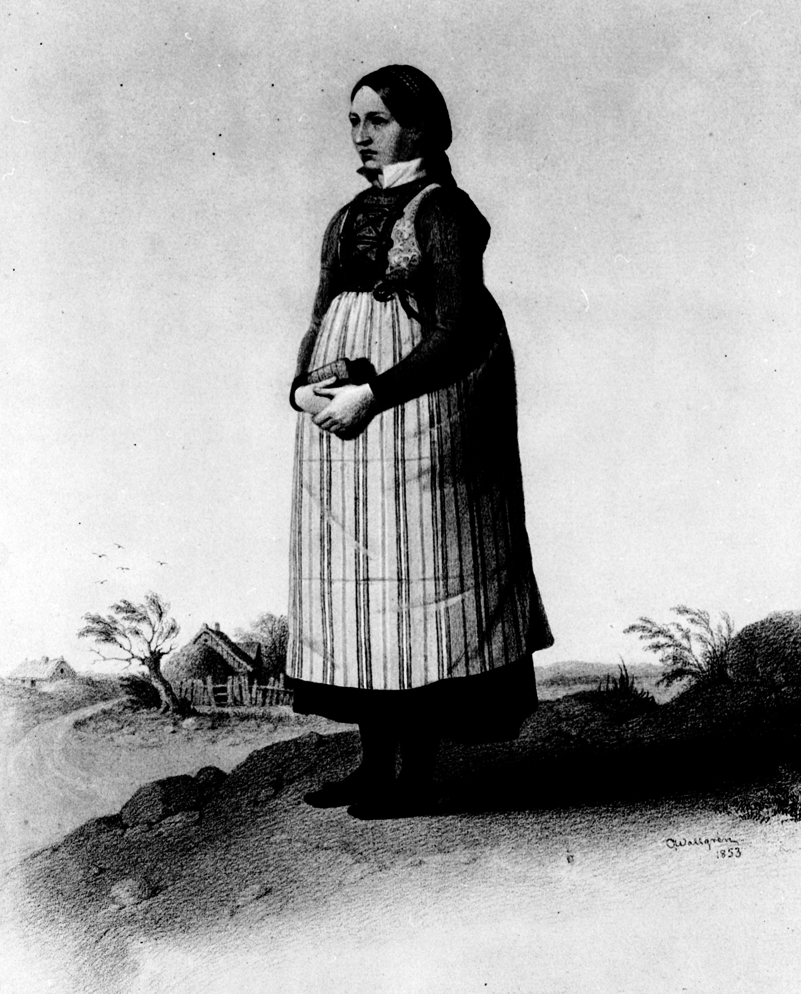 • Otto Wallgren "Skånska allmogens klädedräkter". Kvinna, Torna Härad.