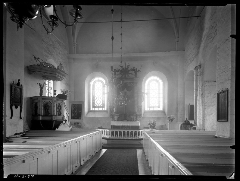 • Dalby. Dalby kyrka. Vy mot altarring och predikstol.