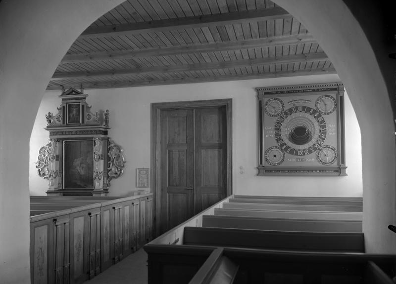 • Fjelie. Fjelie kyrka. Interiör. Vy mot entrén vid vapenhuset.