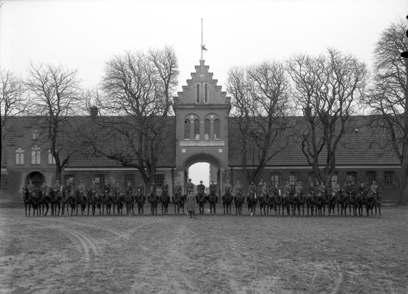 • Flyinge. Flyinge Hingstdepå. Gruppfoto. På parad vid stallingången.