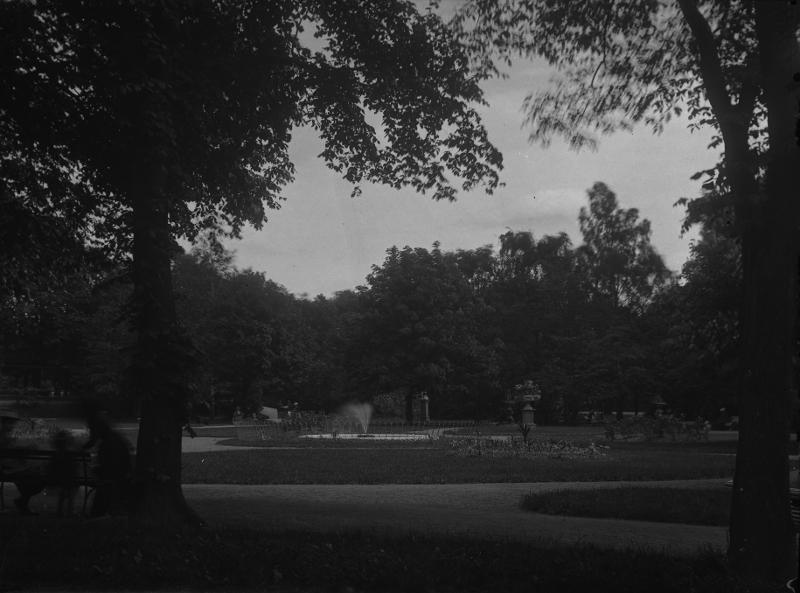 fotografi, urna, kruka, himmel, bänk, bro, gräsmatta, person, fontän, kvinna, park, piedestal, träd, staket, blomma, landskap