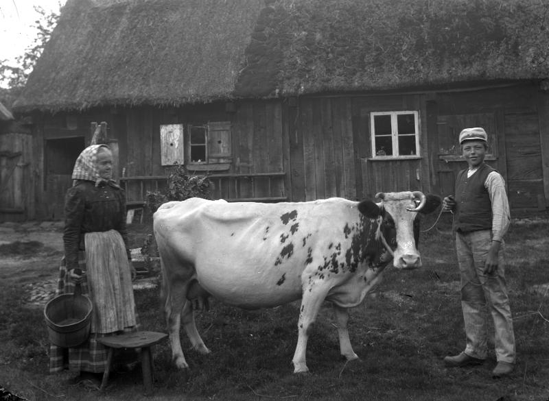 fotografi, hus, stege, piga, halmtak, landskap, gård, ko, pojke, huckle, spann, mössa, pall, kvinna, barn