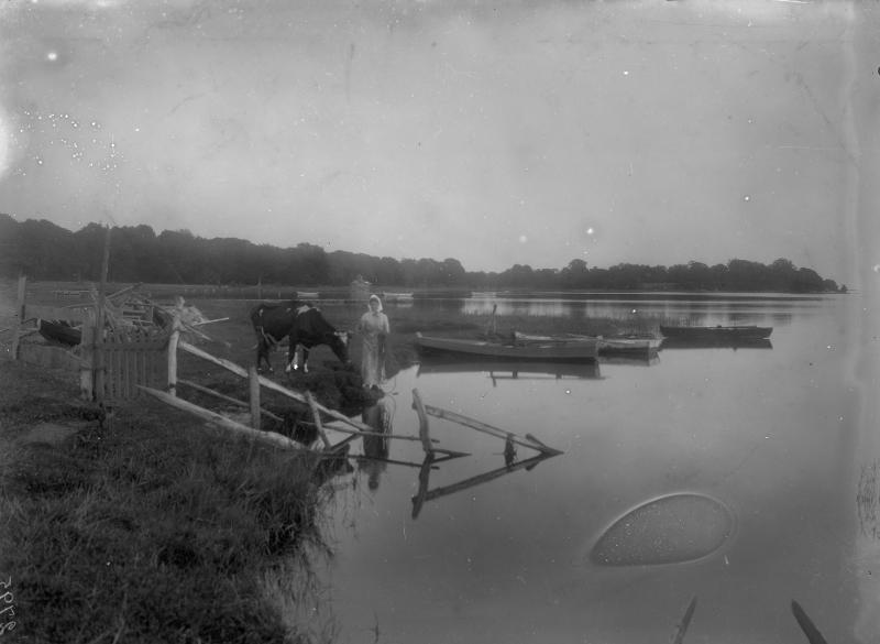 fotografi, landskap, båt, skog, ko, person, äng, roddbåt, grind, pir, sjö, staket, hus, brygga, himmel, byggnad, fiskeredskap, kvinna, huckle, klänning