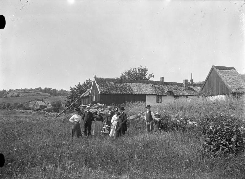 fotografi, man, bondgård, sten, kostym, väst, fluga, klänning, barnvagn, buske, hatt, halmtak, gärdesgård, kvinna, barn, skägg, kedja, person, träd, mustasch, krage, hus, växt, flicka, glasögon, blus, förkläde, gruppfoto, kjol, odlingslandskap, byggnad, skärmmössa