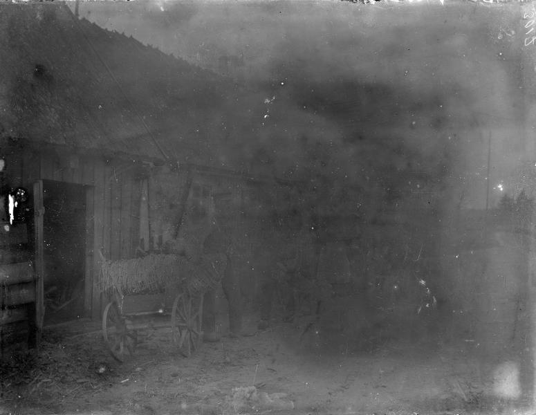 fotografi, kärra, skärmmössa, träsko, kvinna, skjorta, väst, förkläde, person, blus, huckle, halmtak, korg, man, slöjdhäst, landskap, byggnad, träd, hus, kjol, väg