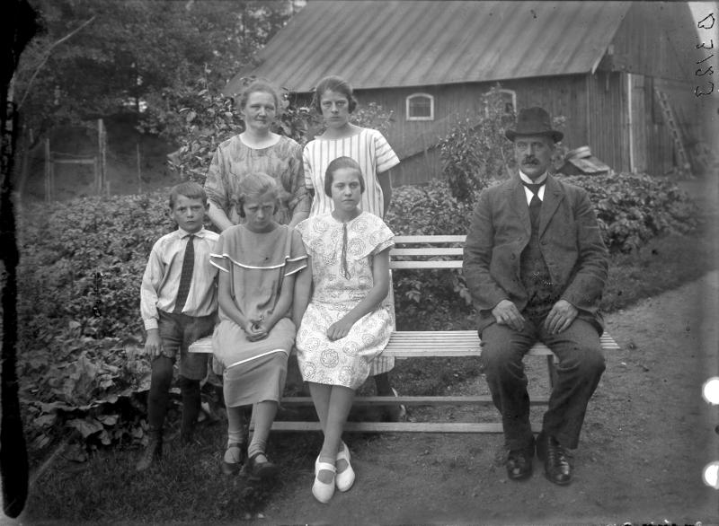 • Man och hustru med sina barn vid en trädgårdssoffa. Okänt datum. Två av flickorna sitter på bänken på behörigt avstånd från fadern. Modern och äldsta dottern stående bakom dem. Ende sonen står t.v. Mannen i mörk kostym och hatt, Kvinnorna har klänningar vars kjollängd tyder på att det är en 1920-talsbild. / Historisk Bildbyrå.